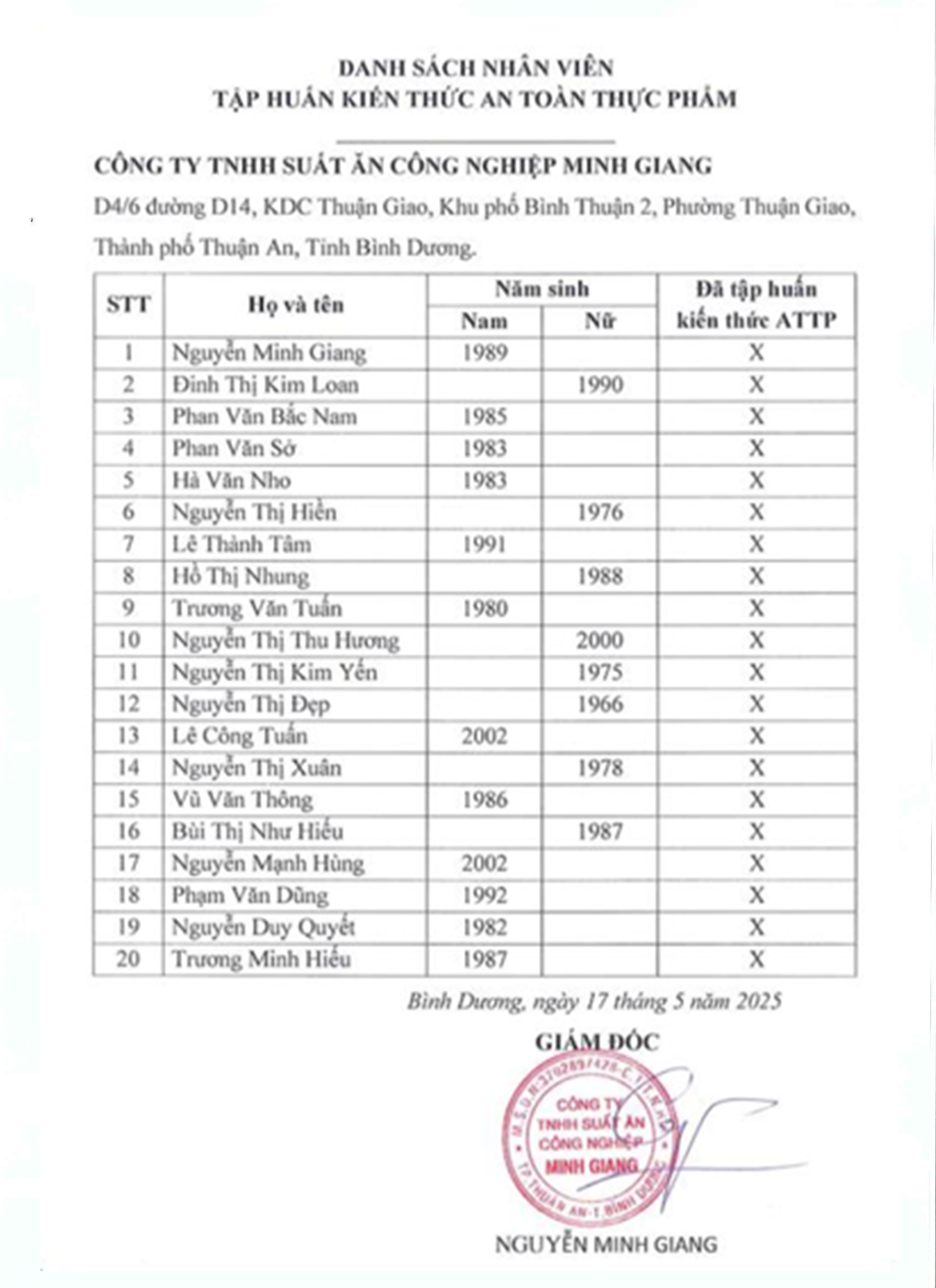 CÔNG TY TNHH SUẤT ĂN CÔNG NGHIỆP MINH GIANG